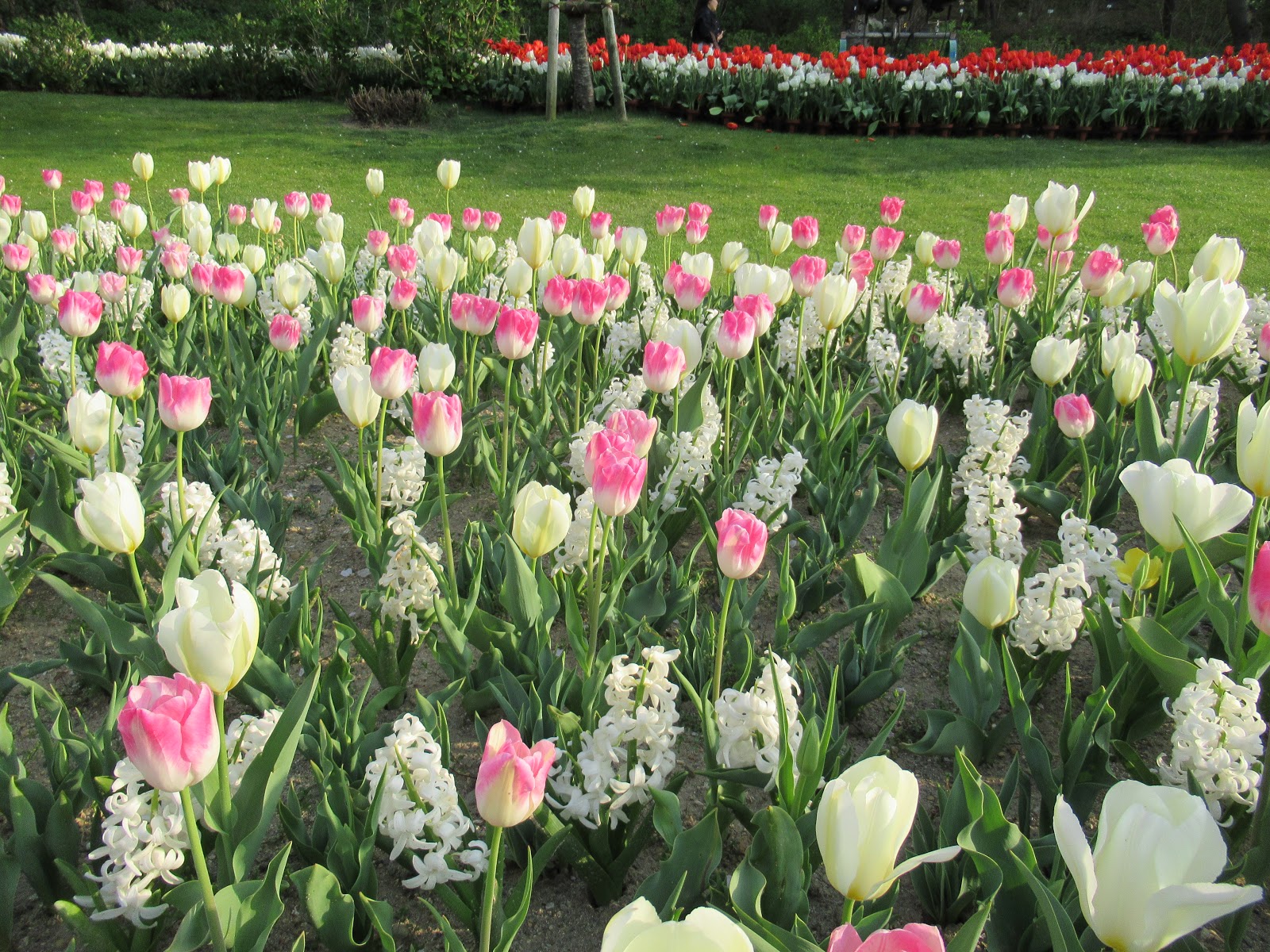 This is a combination with white hyacinth. The pink white tulips were very cute.